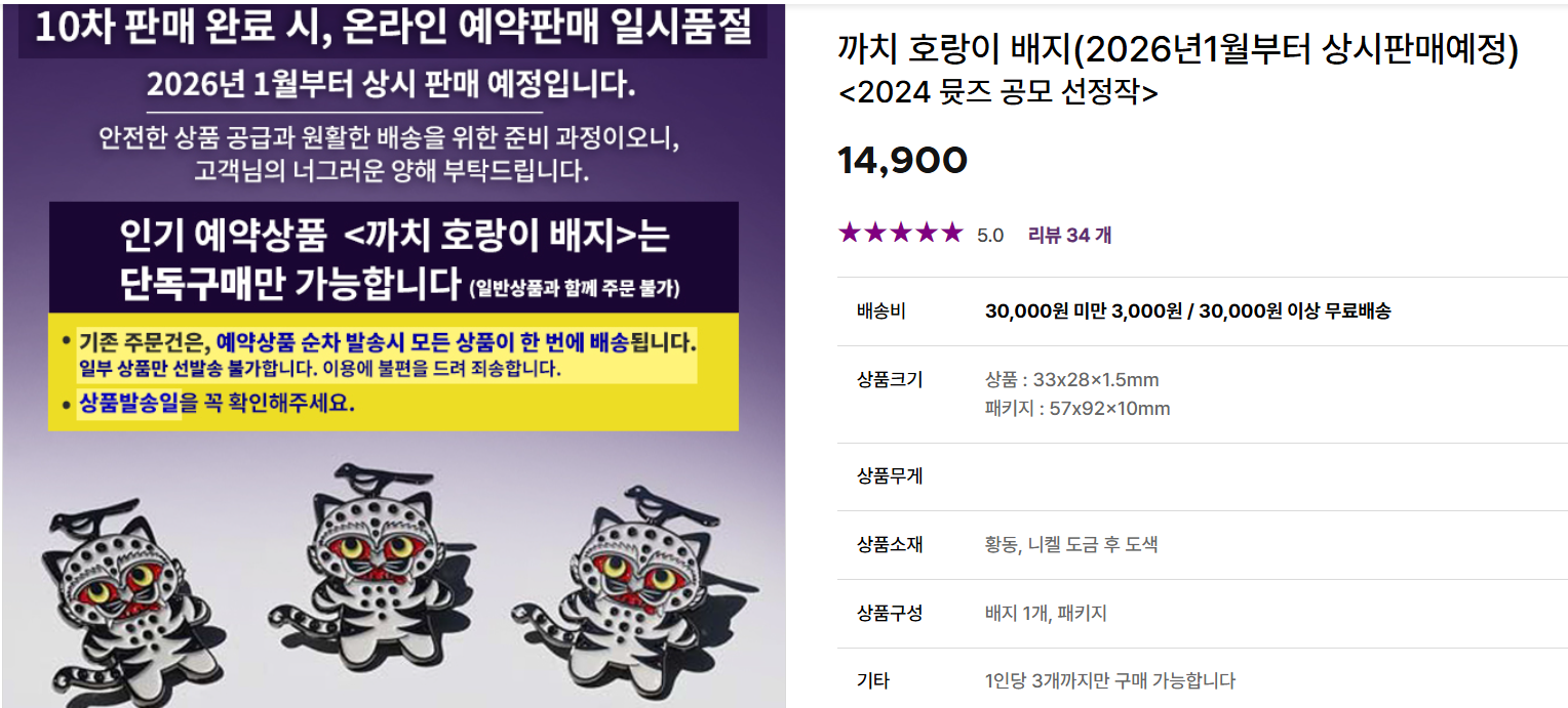 | 🐯 까치호랑이 배지 | 케데헌 인기 캐릭터와 싱크로율 ↑, 품절 속출 |